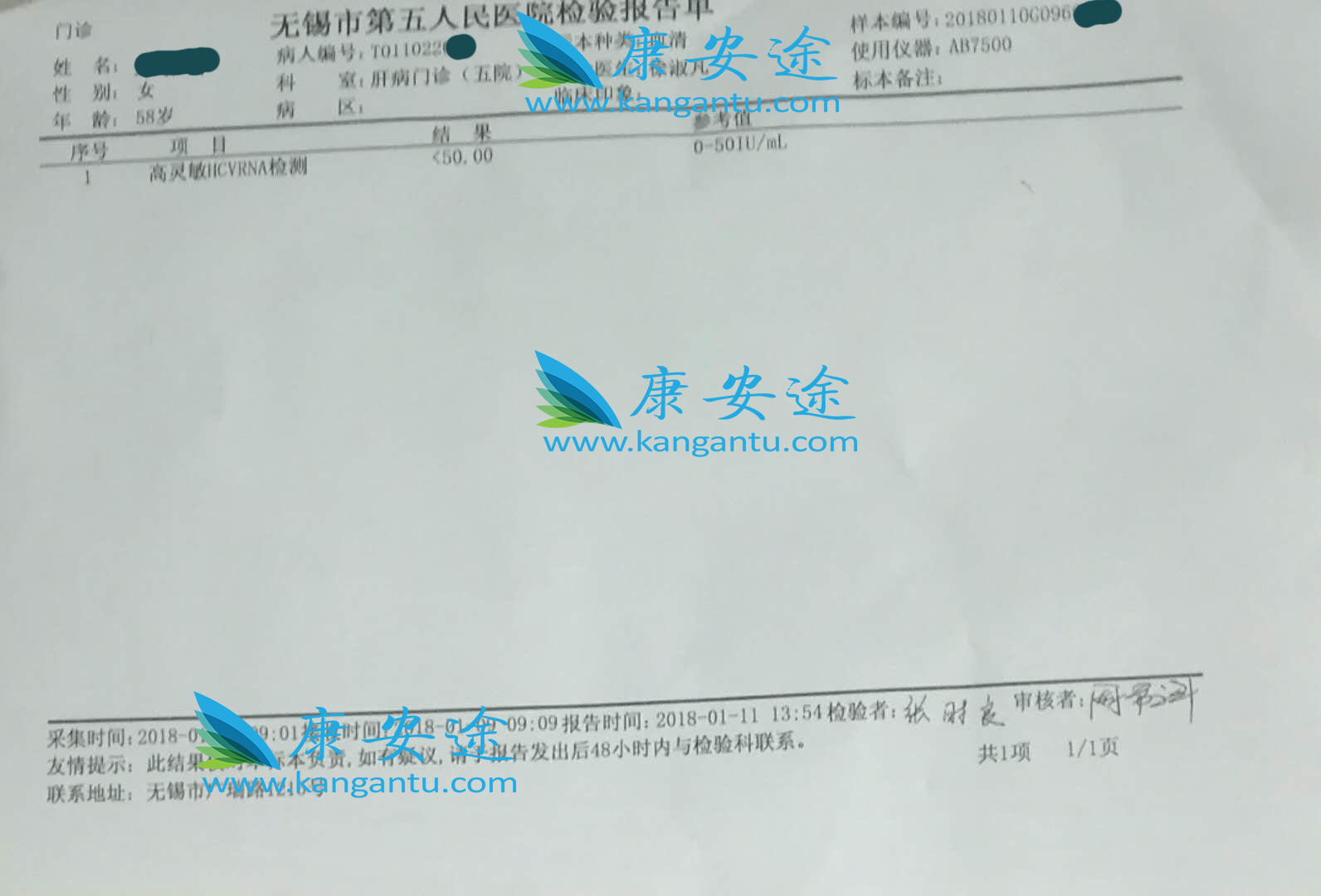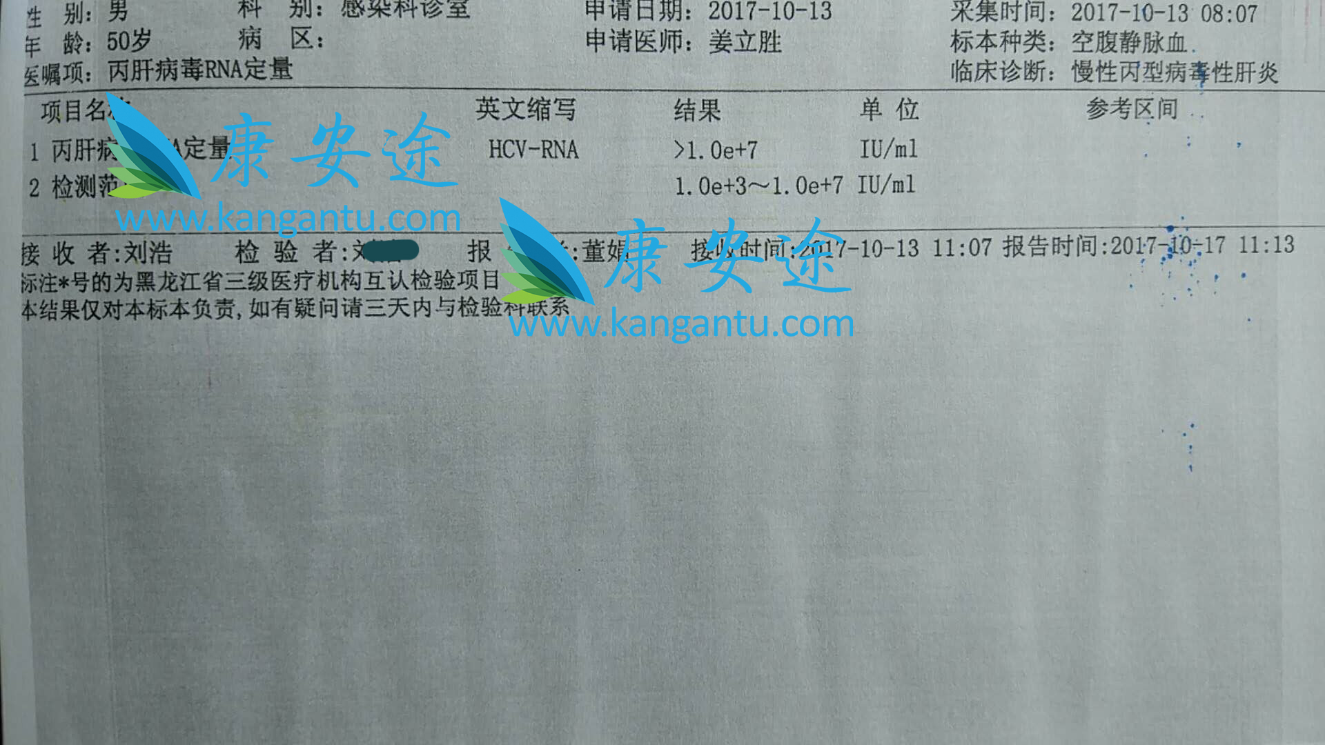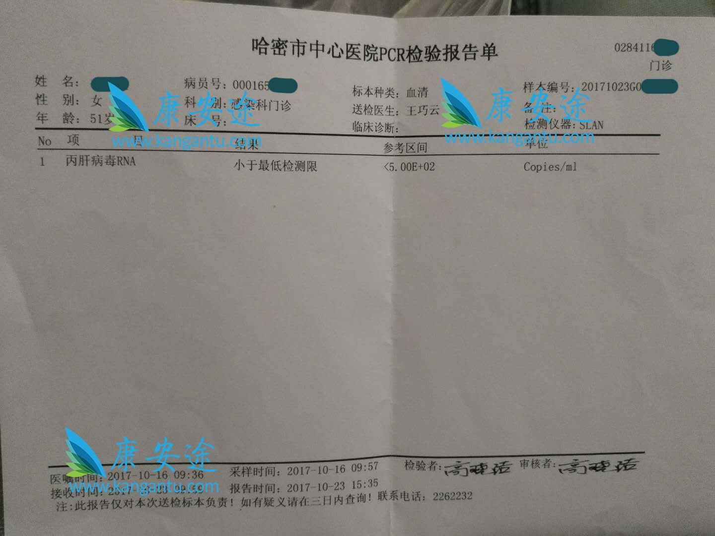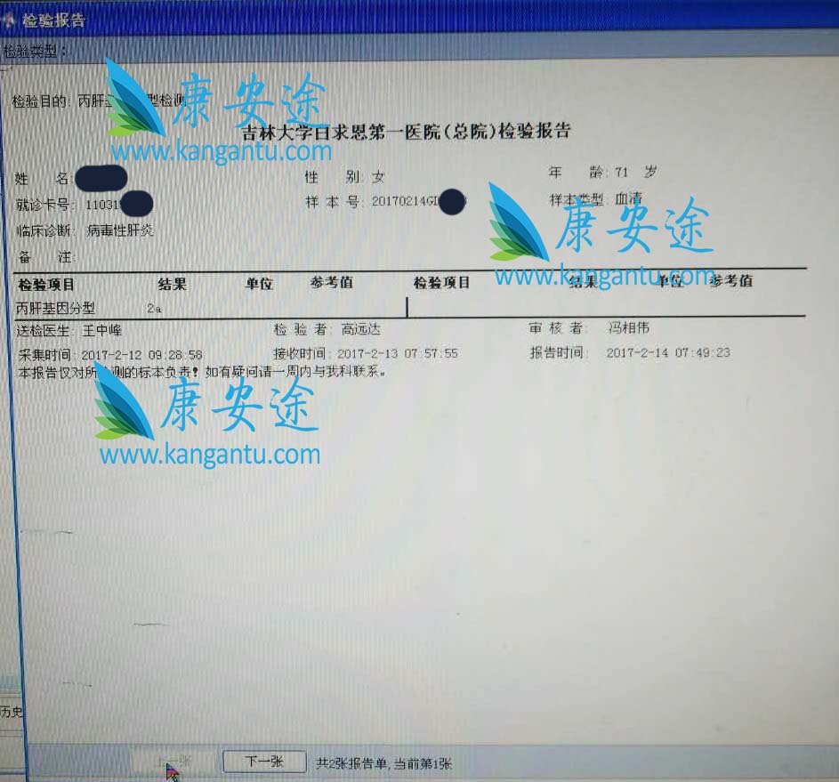丙肝W女士 年龄:71 分型:2a 来自:吉林